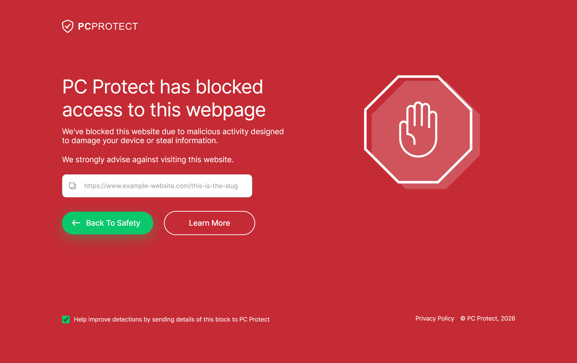 PCProtect blocks access to websites that are dangerous. When PCProtect detects a dangerous website is about to be visited it will block it, and display a block page like seen above. PCProtect blocks websites that host malware, phishing scams, online shopping scams and also other cybersecurity dangers.